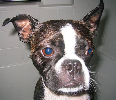 What's worse is I was caught totally off guard with THIS bath. Usually it happens after the park. But nooooooooo, not this time...out of the blue Mom picks me up and puts me in the bathtub prison and starts with the torture. Something about wanting me to smell nice when I go to the vet tomorrow... WHAT!!! The vet? I have to go to the vet? I'm not sick, I feel feel fine.